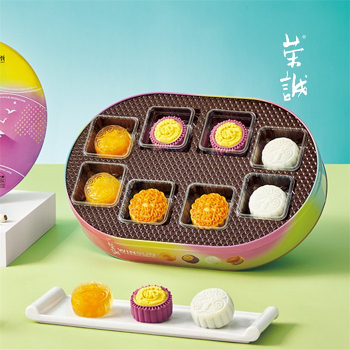 【編 碼】 YBT2309 【條形碼】 6925755522499 【尺 寸】 36.5x24.5x6.3cm 【凈含量】 600g 【規(guī) 格】 600gx8盒/箱 【內(nèi)容物】 80g蛋黃白蓮蓉月餅x2,80g水晶皮月餅(豆蓉芒果奶皇味)x2,60g冰皮月餅(豆蓉榛子可可)x2,80g桃山皮月餅(豆蓉藍(lán)莓芝士)x2
