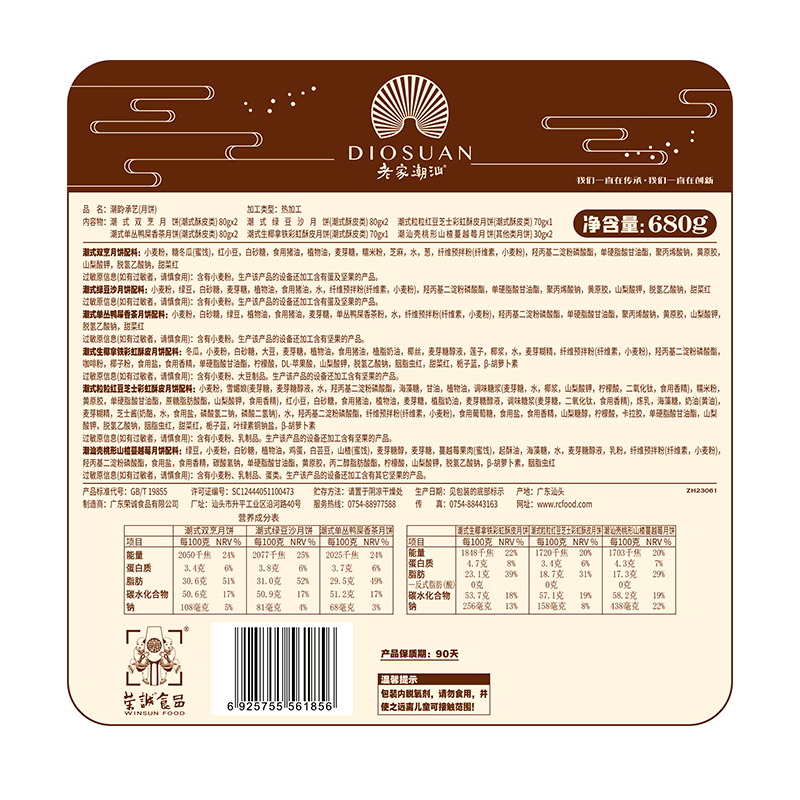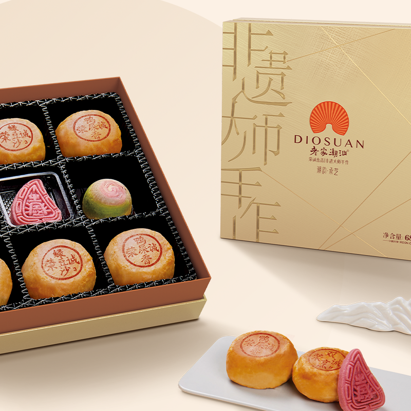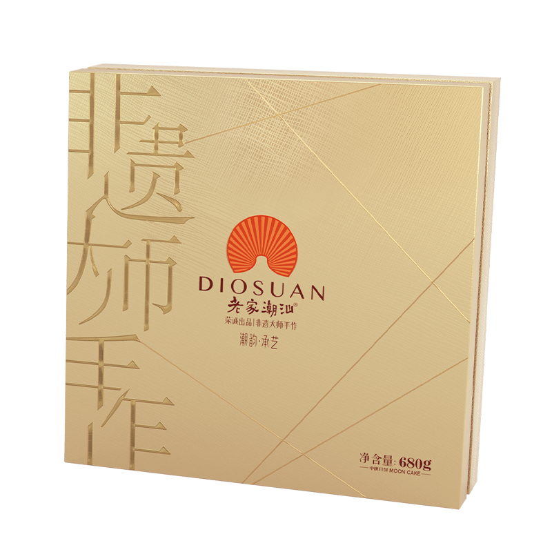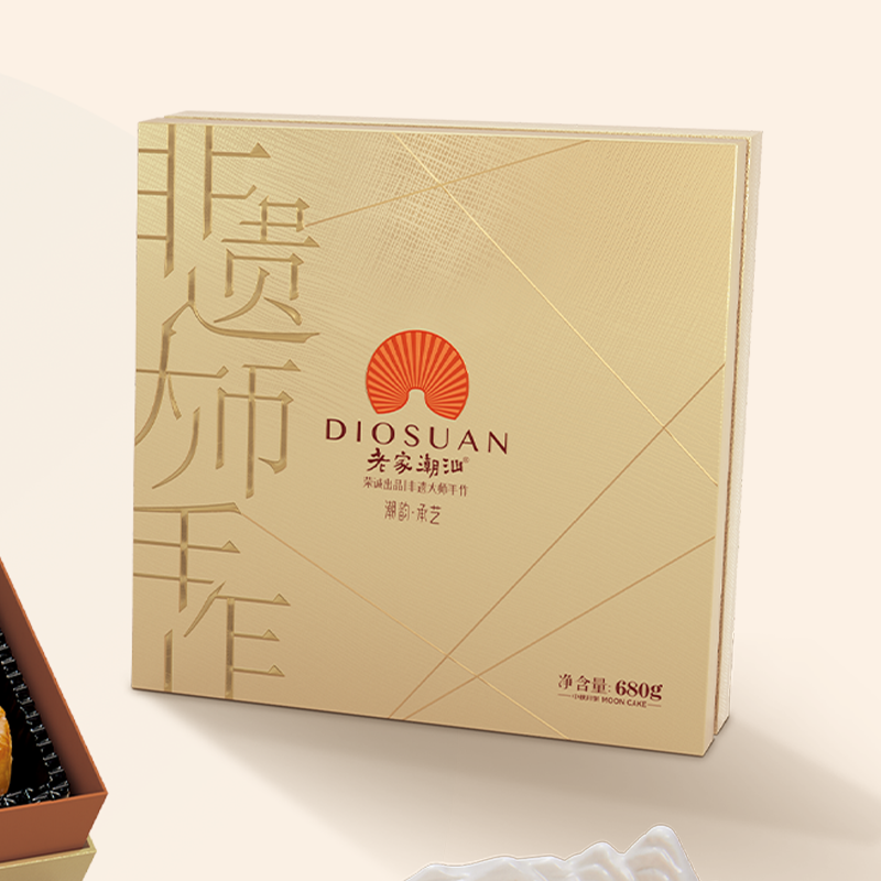 【編 碼】 YBZ2318 【條形碼】 6925755561856 【尺 寸】 30x30x7.5cm 【凈含量】 680g 【規(guī) 格】 680gx8盒/箱 【內(nèi)容物】 80g潮式雙烹月餅x2+80g潮式綠豆沙月餅x2+80g潮式單叢鴨屎香茶月餅x2+70g潮式生椰拿鐵彩虹酥皮月餅x1+70g潮式粒粒紅豆芝士彩虹酥皮月餅x1+30g潮汕殼桃形山楂蔓越莓月餅x2