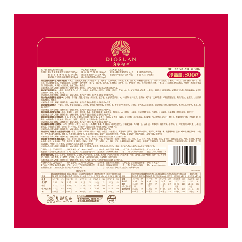 【編 碼】 YBT2319 【條形碼】 6925755561863 【尺 寸】 25x25x15cm 【凈含量】 800g 【規(guī) 格】 800gx6盒/箱 【內(nèi)容物】 80g潮汕雪媚娘蛋黃烏豆沙酥皮餅x1+80g潮汕雙烹酥皮餅x1+80g潮汕單叢鴨屎香茶酥皮餅x1+80g潮汕黃皮酥皮餅x1+30g潮汕報春紅殼桃糕點(山楂蔓越莓)x3+30g潮汕金葉黃殼桃糕點(肉松)x3+70g潮汕青梅桑椹彩虹酥x1+70g潮汕百香果洛神花彩虹酥x1+70g潮汕檸檬卡曼橘彩虹酥x1+30g香妃鳳梨酥x3